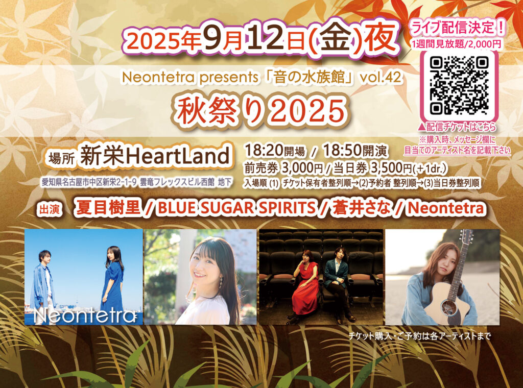 • 備考:Neontetra予約/購入でスタンプラリー2025年9月対象ライブ(配信チケットも対象です。配信チケット購入時に、アンケートで「Neontetra」を選択し、ご購入。その後、Hpのcontactフォームからご申請ください)