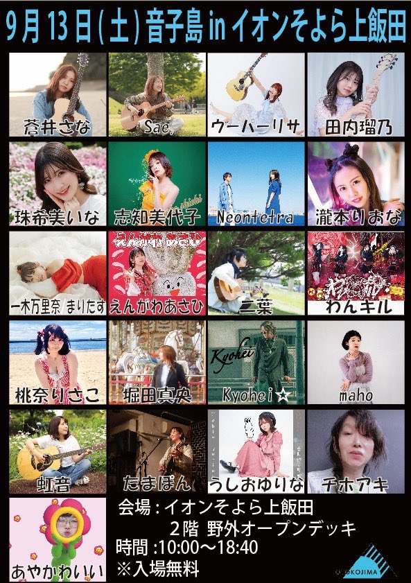 ホームLIVEFREE 2025年9月13日(土)名古屋・そよら上飯田イオン 2025.7.102025.9.3 「音子島inそよら上飯田イオン」 場所:愛知県「そよら上飯田イオン」 出演時間:15時50分~ 観覧料:観覧無料 物販:ライブ終了後に実施 備考:Neontetra公式Youtubeにてライブ配信予定