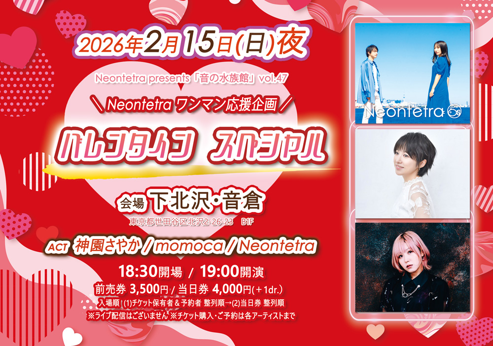 - イベント名:Neontetra presents「音の水族館」vol.47 Neontetra ワンマン応援企画「バレンタイン スペシャル」